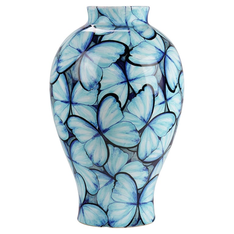 Blue Ceramic Majolica Vase Vessel Decorative Butterflies Hand Painted Italy For Sale At 1stdibs